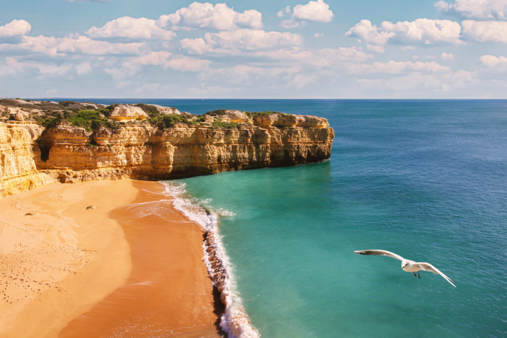 Coastline. Seagull. Albufeira, Portugal ID: 76444 Elevated view of a seagull gliding over dramatic coastline.