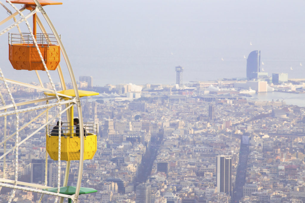 Colorful ferris wheel in the Tibidabo amusement park mountain with the Barcelona city view