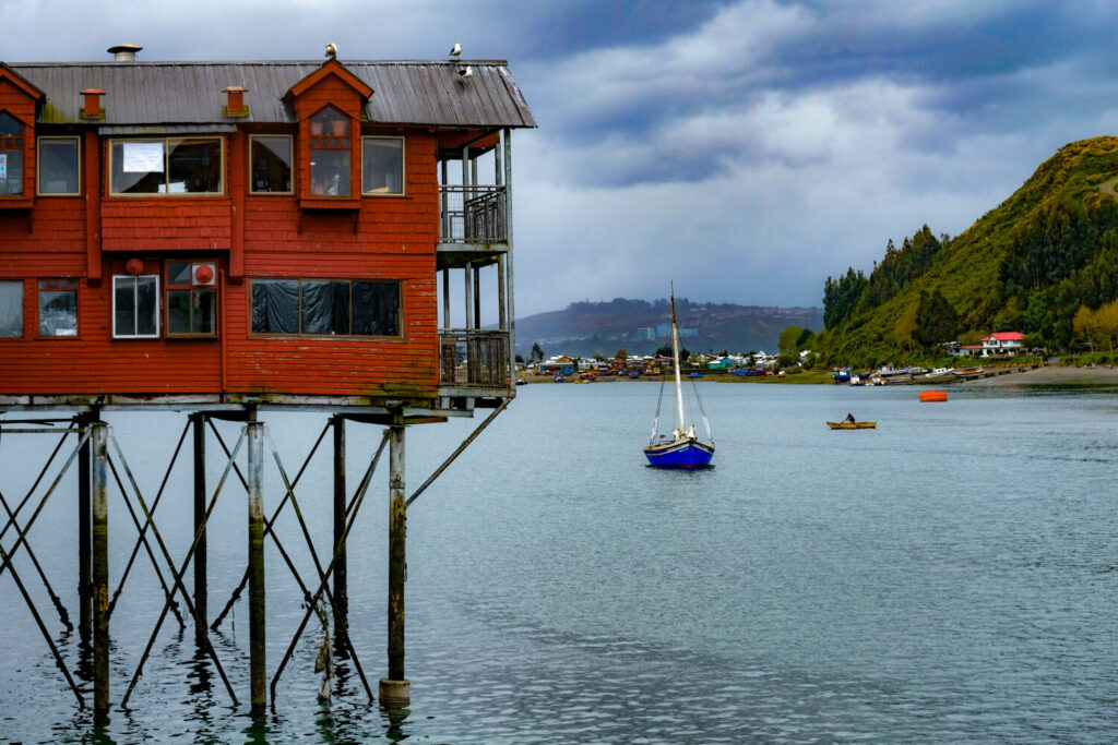 Colorida casa tradicional sobre pilotes en el pueblo pesquero de Puerto Montt en Chile