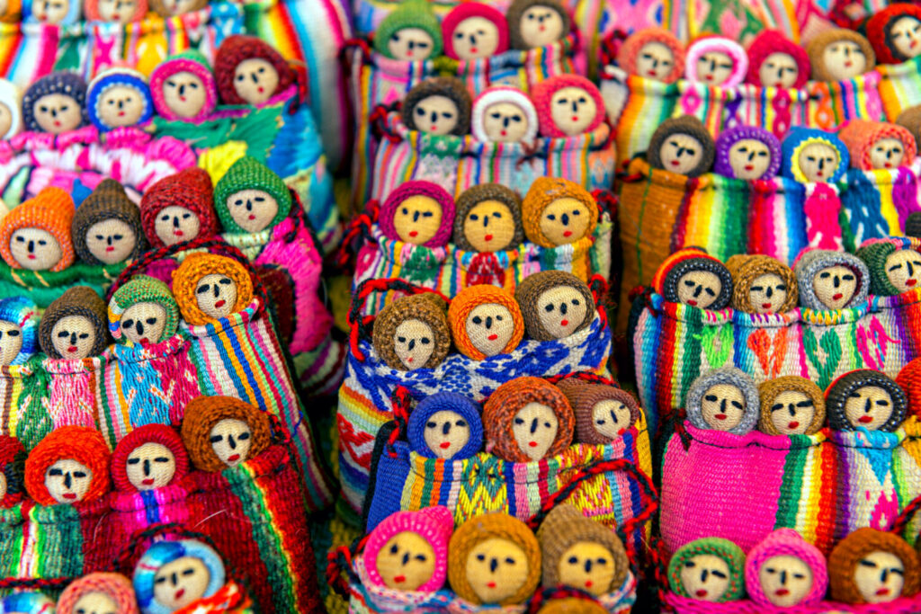 Coloridas muñecas peruanas artesanales vendidas en el mercado tradicional del Valle Sagrado, Perú.