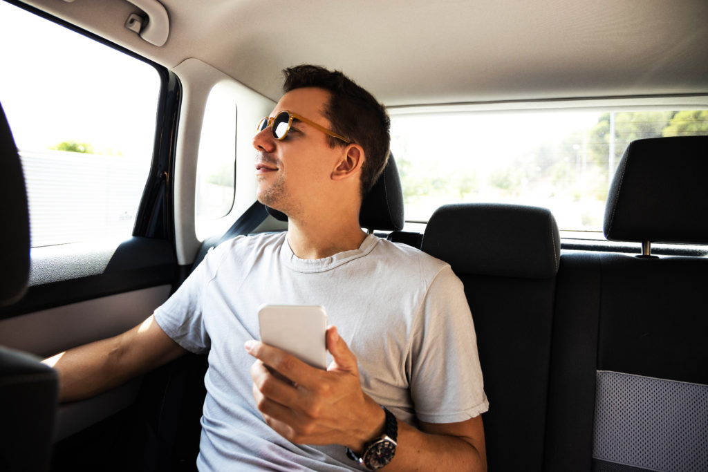 Comfortable guy in the back seats during car sharing using mobile phone app.