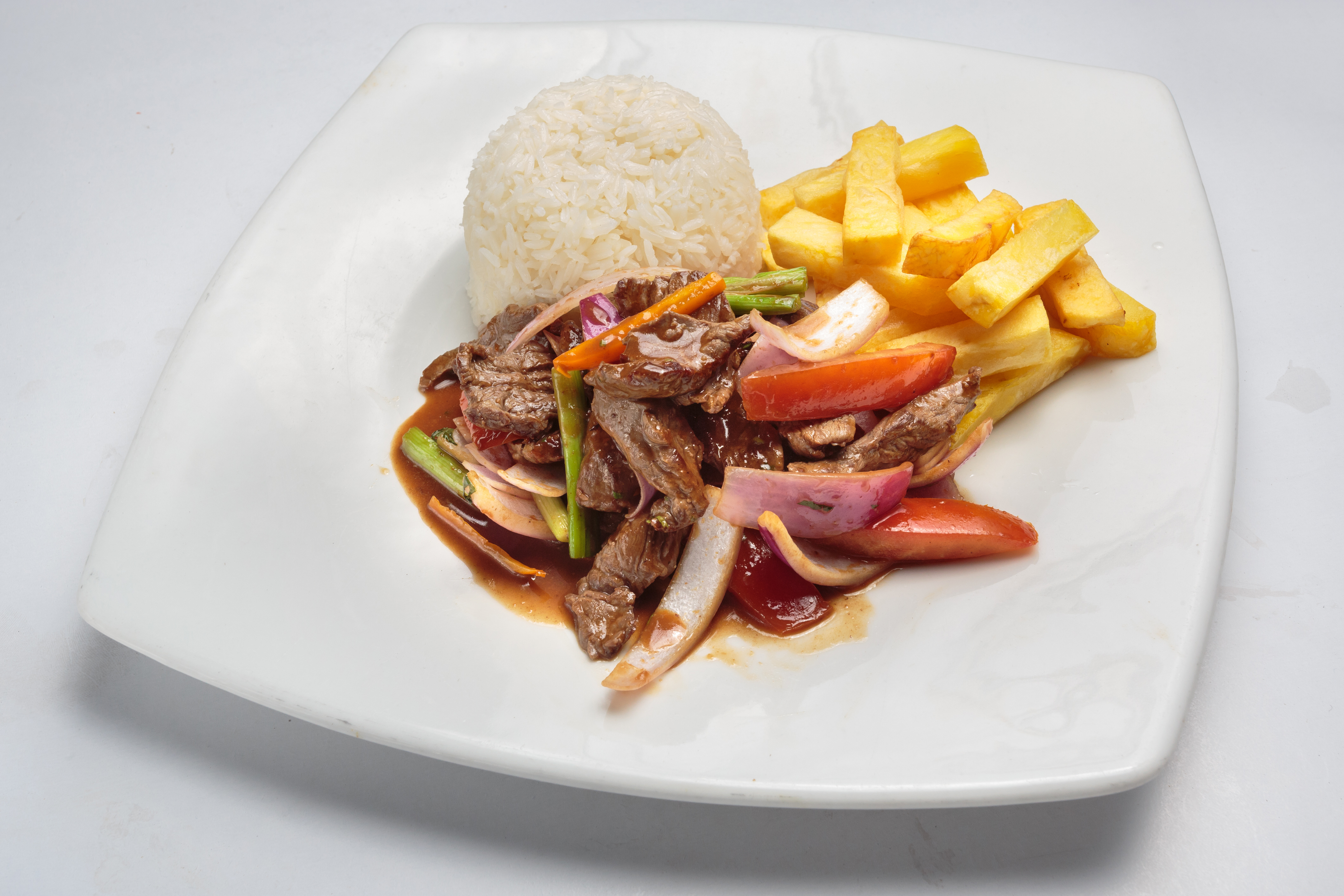comida peruana lomo saltado carne salada con tomates cebolla patatas