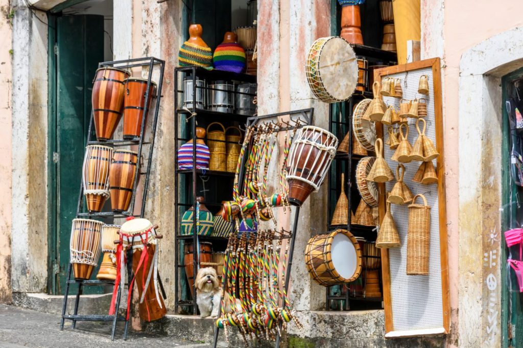 Commerce of typical products and musical instruments of various types on the streets of Pelourinho in the city of Salvador, Bahia