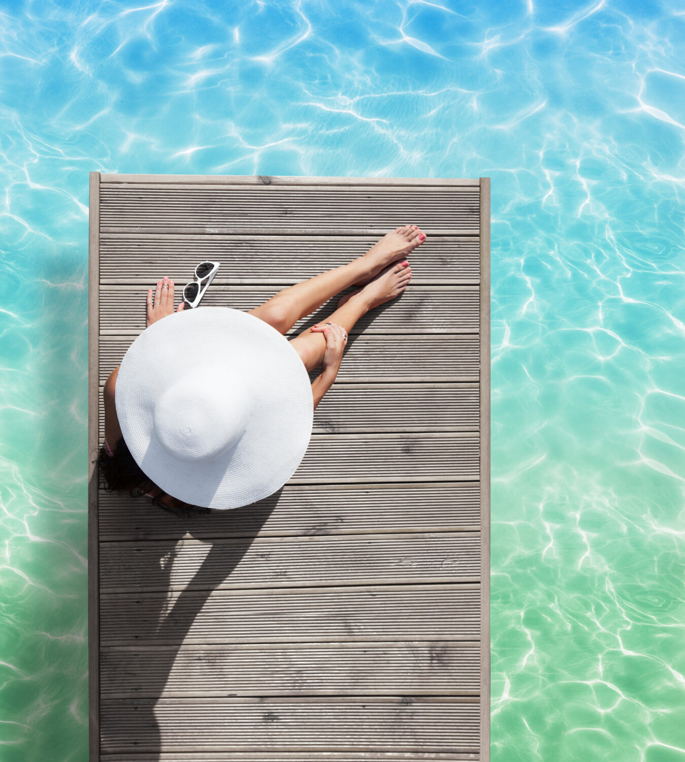 Concepto de moda veraniega – Mujer bronceadora con sombrero de sol en la piscina sobre un muelle de madera desde arriba