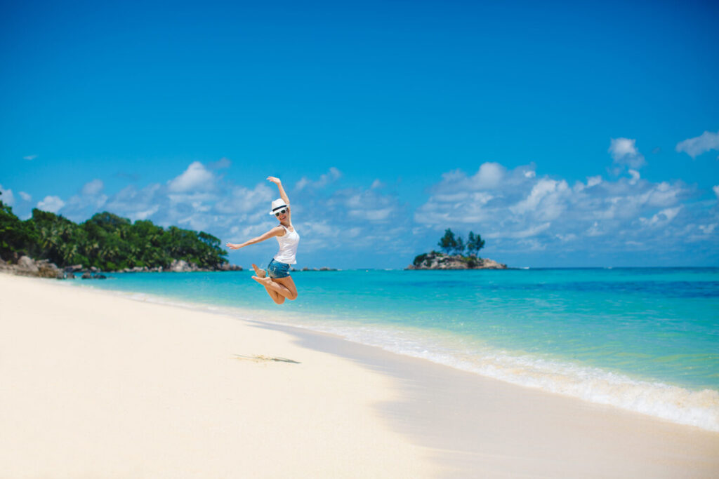 concepto de verano y vacaciones – mujer riéndose saltando a la playa