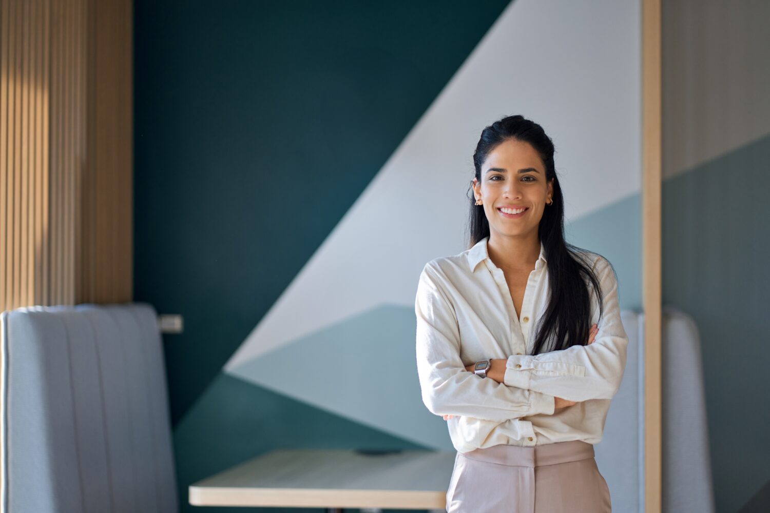 Confiada trabajadora profesional joven de la empresa latinoamericana, directora ejecutiva, trabajadora o empresaria mirando a la cámara de pie los brazos cruzados en la oficina moderna, retrato.
