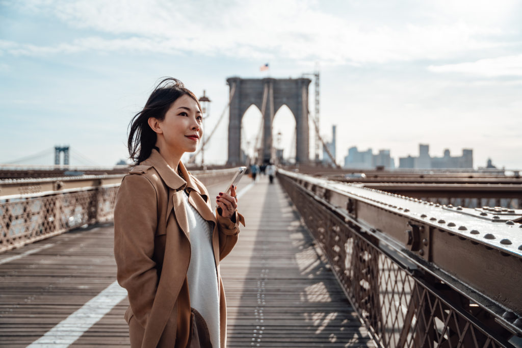 Confident businesswoman using smart phone on Brooklyn Bridge, New York