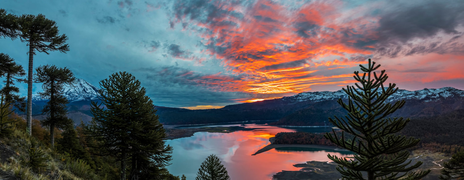 Conguillio National Park, considered as one of the best ten forest in the world is an amazing place for visiting during the Autumn Season to see colorful images like this one with an amazing red sky