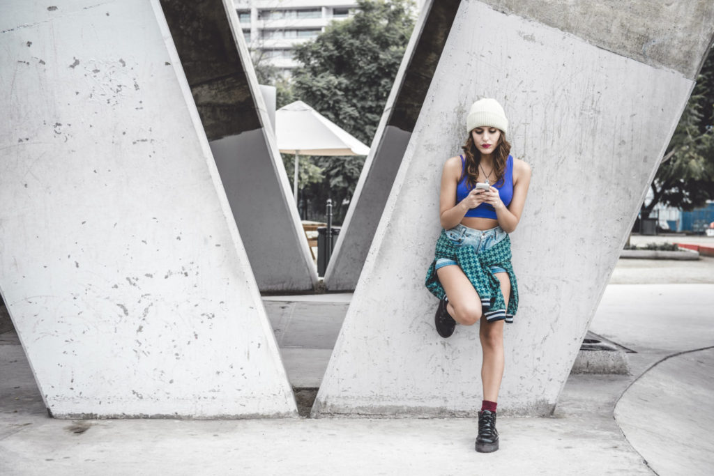 Cool urban young woman using her smart phone in the city wearing hip hop outfit.