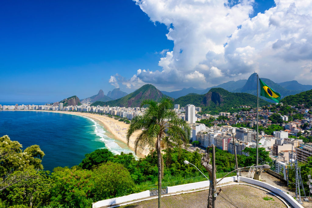 Copacabana beach in Rio de Janeiro, Brazil. Copacabana beach is the most famous beach of Rio de Janeiro, Brazil. Skyline of Rio de Janeiro with flag of Brazil