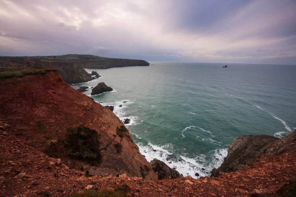 Cornwall, England: aerial view of the rocky coast on a cloudy day.