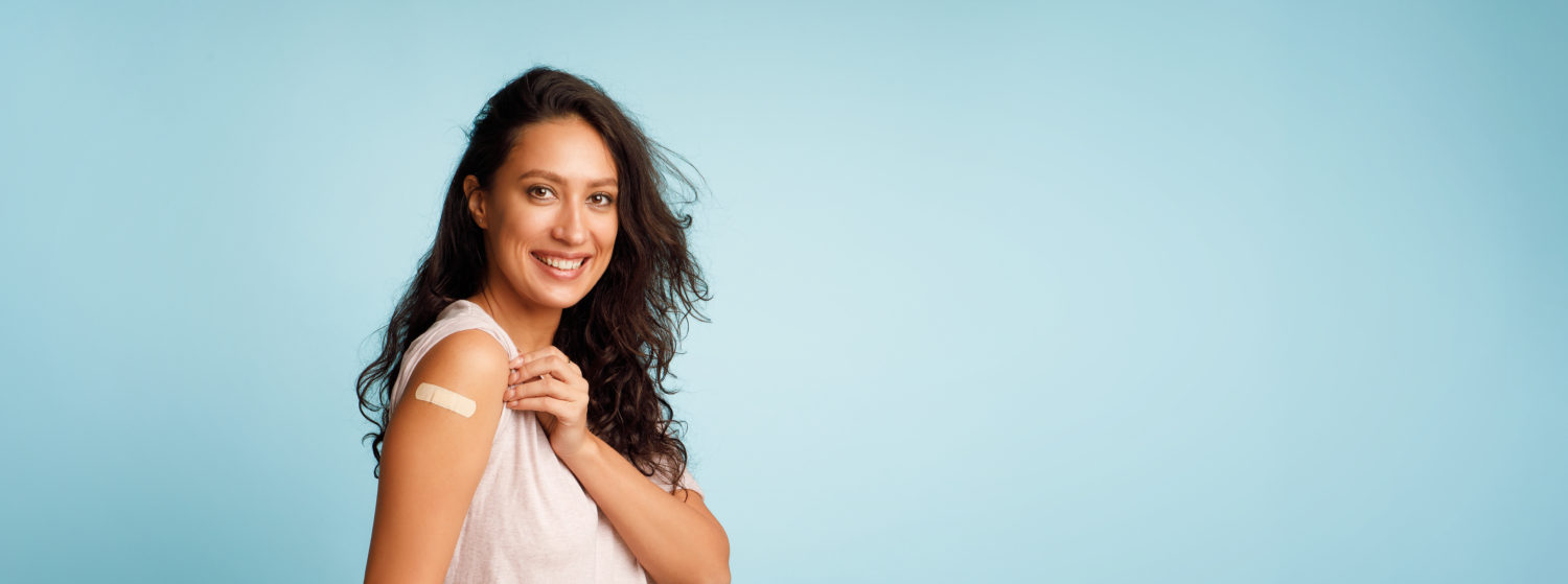 coronavirus vaccination advertisement happy vaccinated woman showing arm with plaster