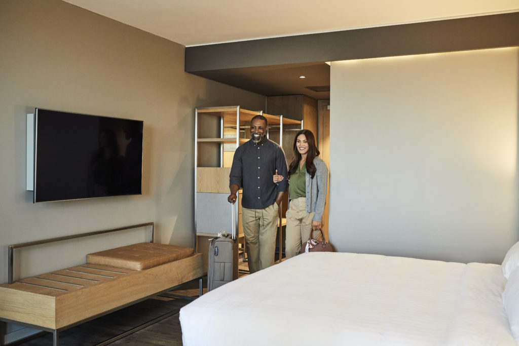 Smiling heterosexual couple arriving in hotel room. Male and female are talking during weekend. They are wearing casuals.