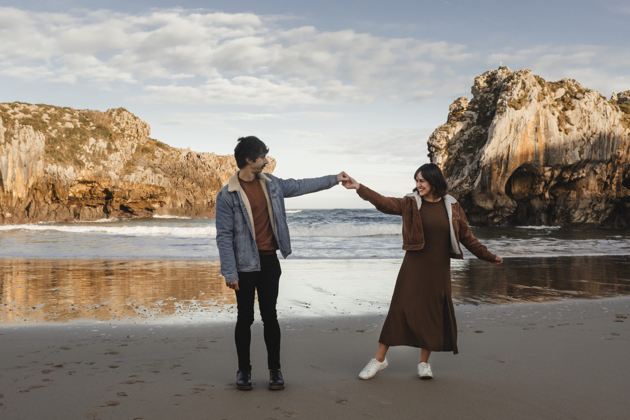 Caucasian young couple dancing on the beach during sunrise wearing a dress and denim jacket with the sea and mountains in the background in asturias