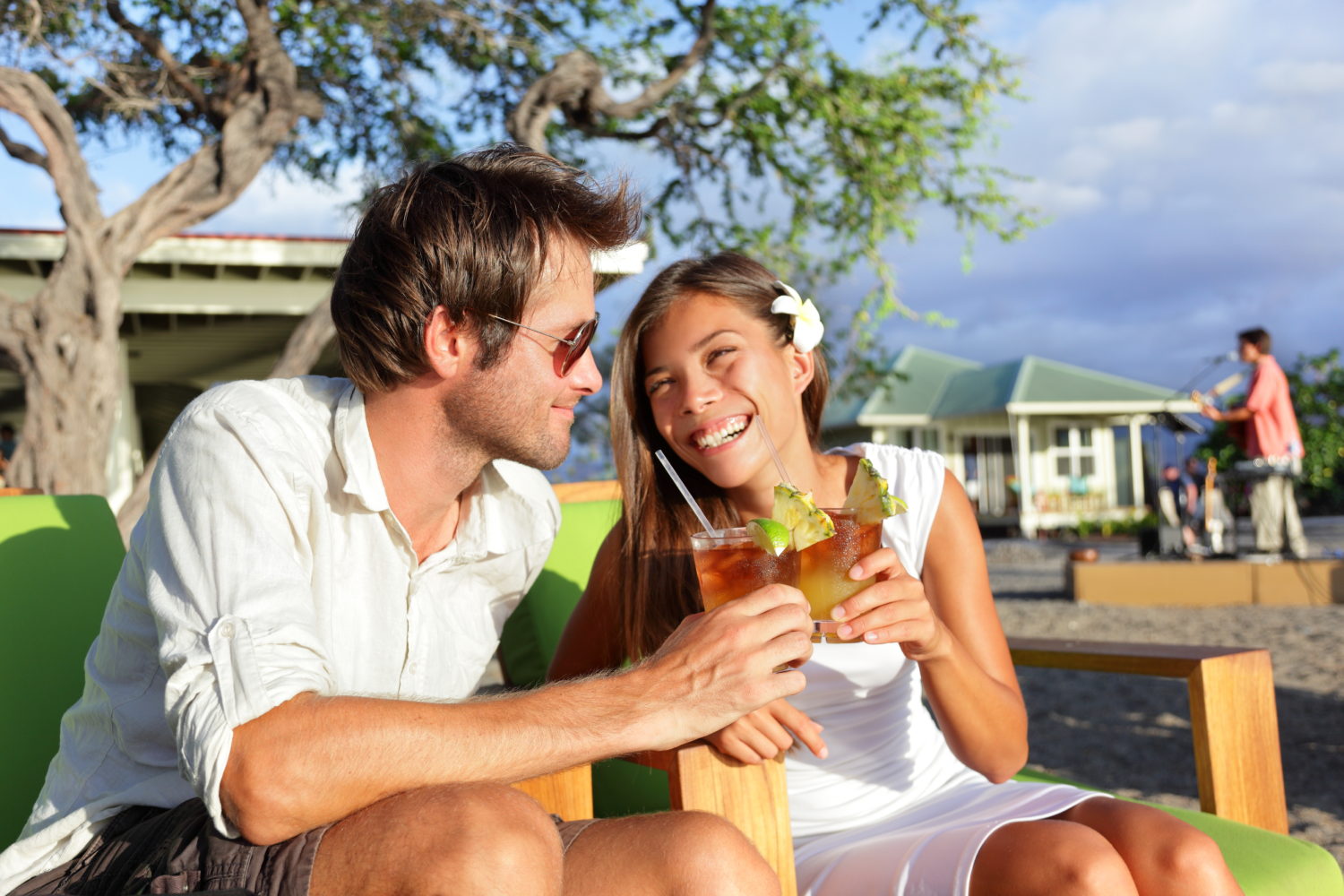 couple drinking alcohol mai tai cocktails at hawaii beach bar