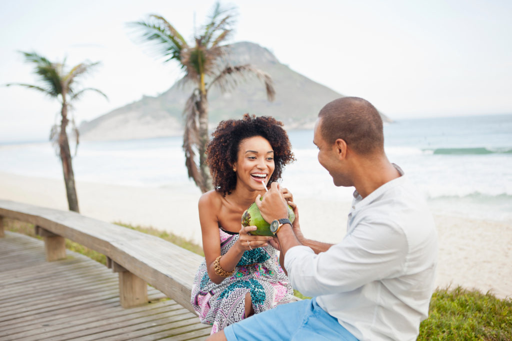 Couple drinking coconut milk on boardwalk, Rio De Janeiro, Brazil