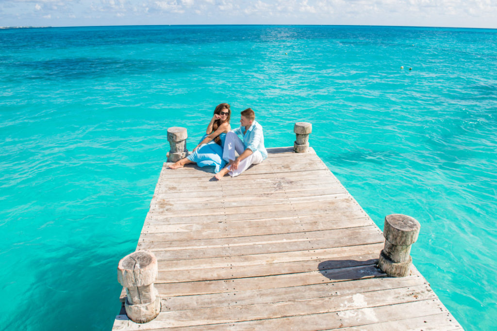 Couple having good time at the sea. They are sitting at the wooden pier, hugging and smiling. Turquoise water is around them. Drone view picture.