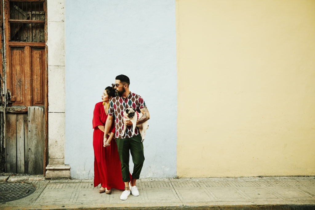 Couple holding hands and standing in front of colorful wall