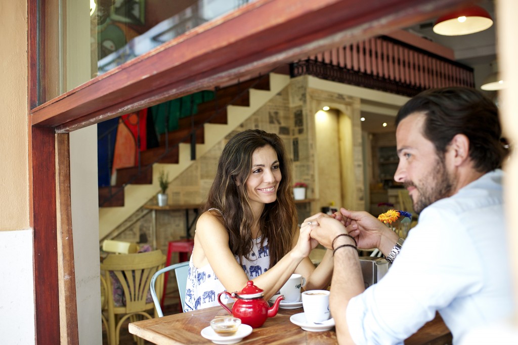 Couple holding hands over a cafe table