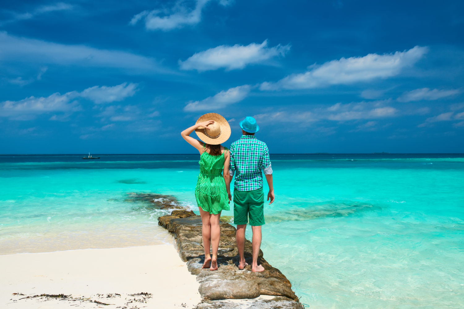 couple in green on a tropical beach at maldives