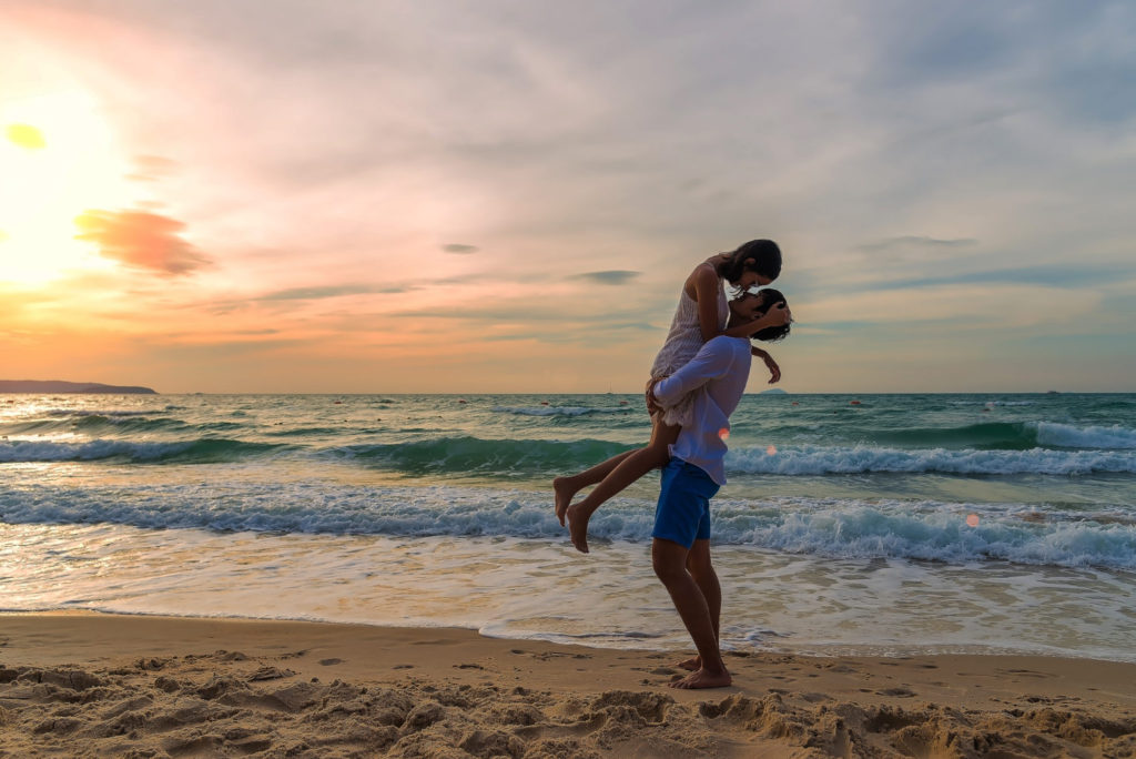 couple in love having romantic tender moments at sunset on