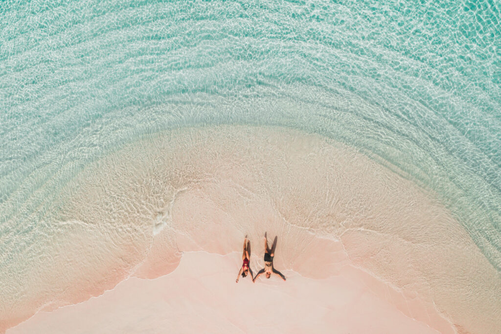 Couple lying on famous pink beach in Komodo national park. Turquoise mint color clear water, tropical vacations on honeymoon. Drone aerial view from above.