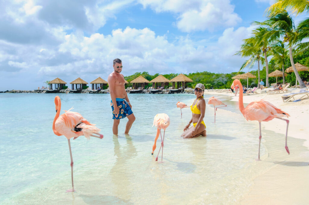 a couple of men and women on the beach with pink flamingos at Aruba Island Caribbean on a sunny day
