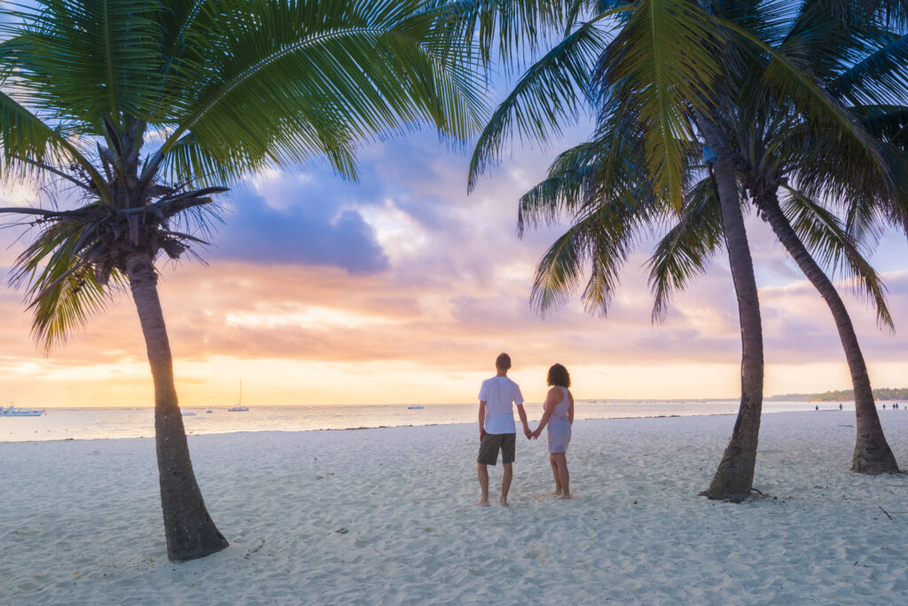 Bavaro Beach, Bavaro, Higuey, Punta Cana, Dominican Republic. Couple on the beach at sunrise (MR).