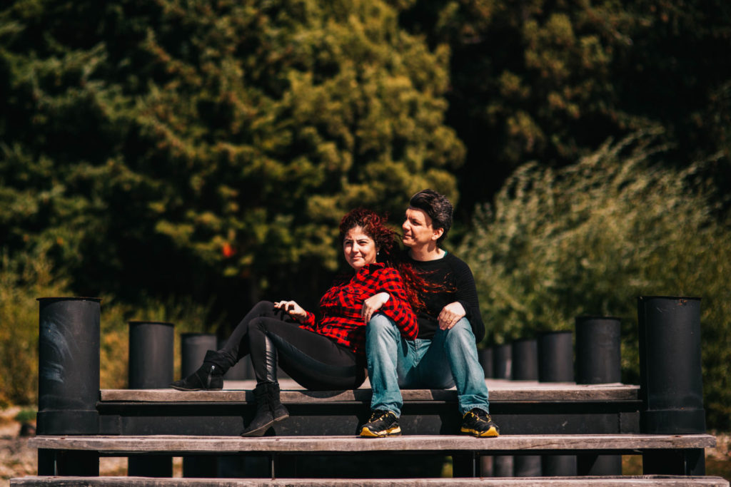 couple sitting on a pier with the background of a ID: 49071 couple sitting on a pier with the background of a windy Patagonian forest