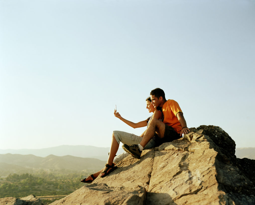 Couple sitting on top of mountain, using mobile camera phone ID: 69469 Overlooking view, Vasquez Rocks, Agua Dulce, California, USA