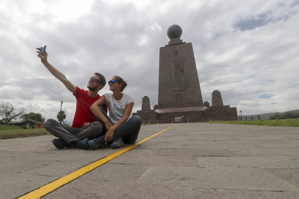 Couple taking a selfie at the yellow line dividing the two hemispheres at the Monument to the Equator, Ciudad Mitad del Mundo, Ecuador