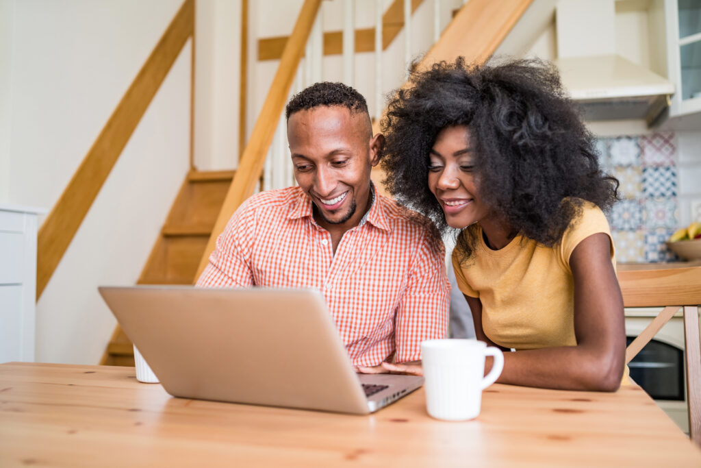Couple using laptop at home