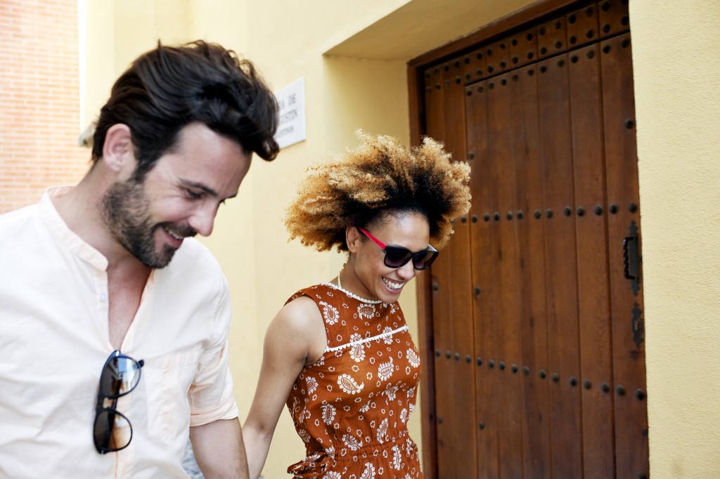 Couple walking past wooden door of building