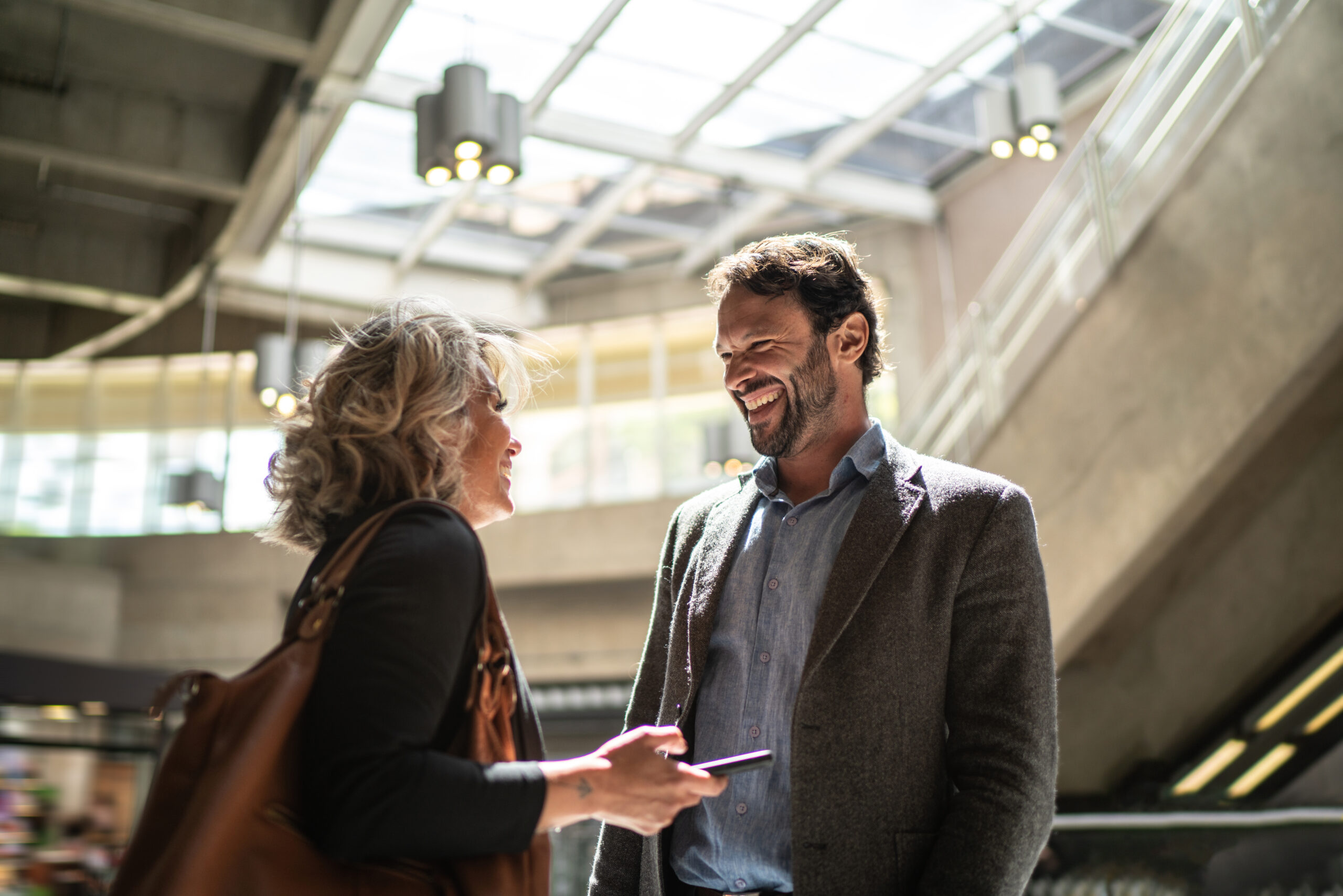 Coworkers talking at a subway station