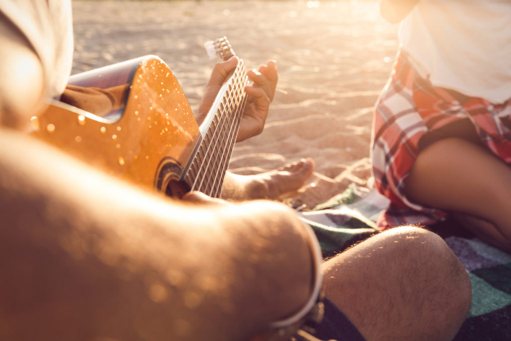 Cropped image of a guy playing guitar for his friends at the beach