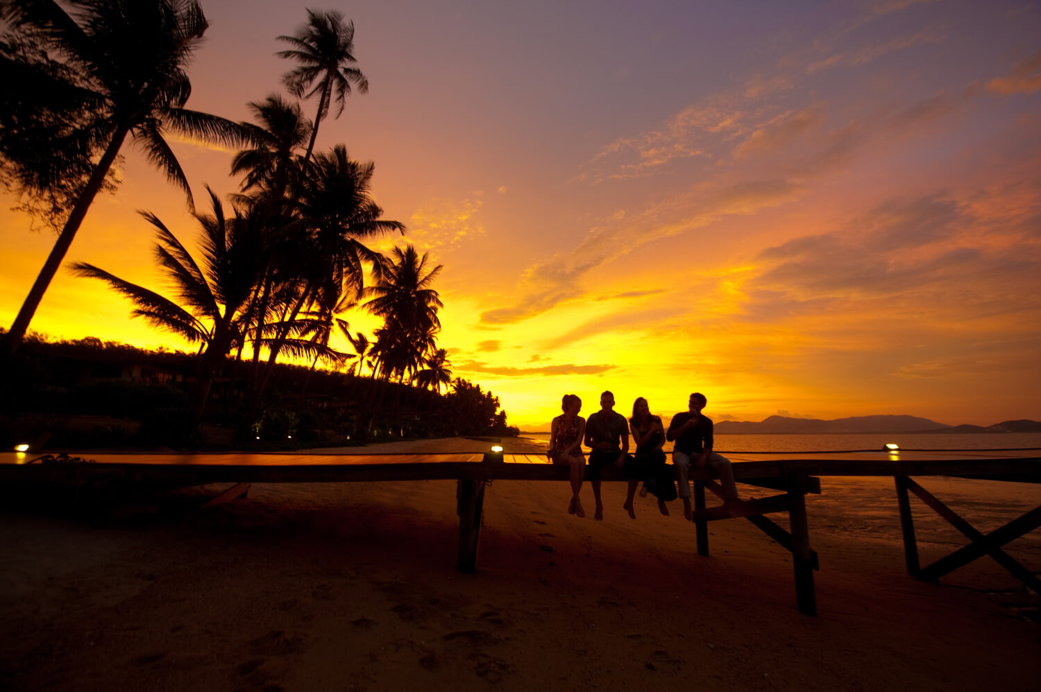 cuatro amigos sentados en un espigon de una isla tropical