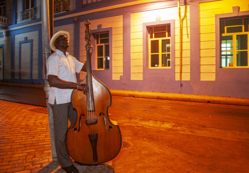 Cuba. Man playing bass in Santiago de Cuba.