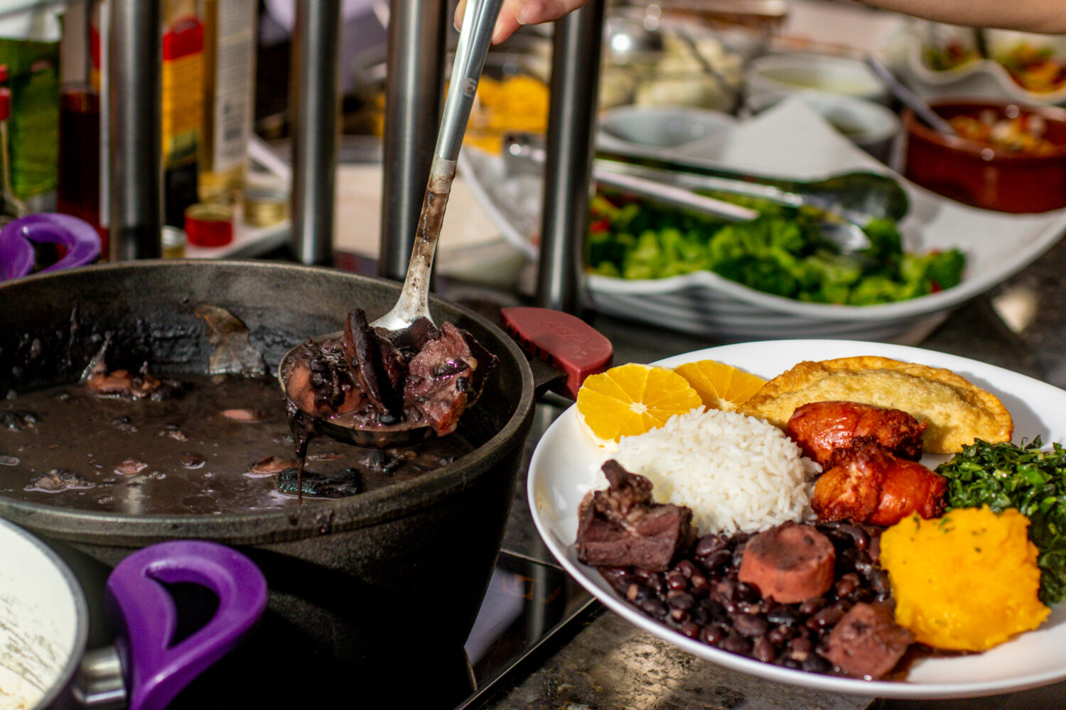 cuchara con la mano con la feijoada brasileña para servir en la mesa
