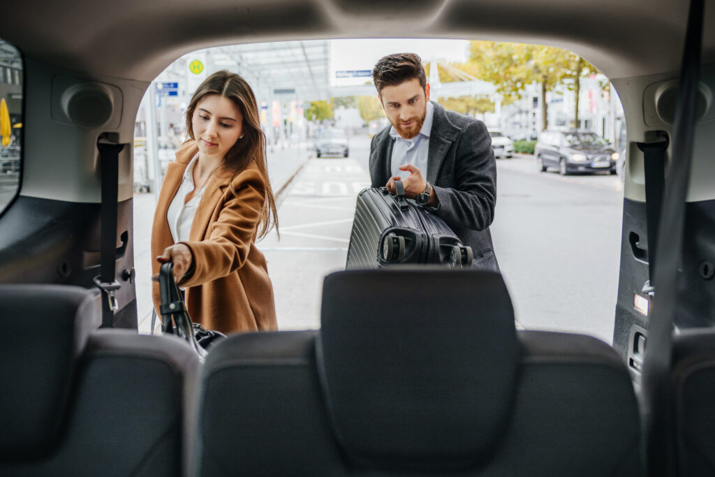 A couple is seen from the backseat of a car, loading their suitcases, as they prepare to enter the airport for their departing flight.