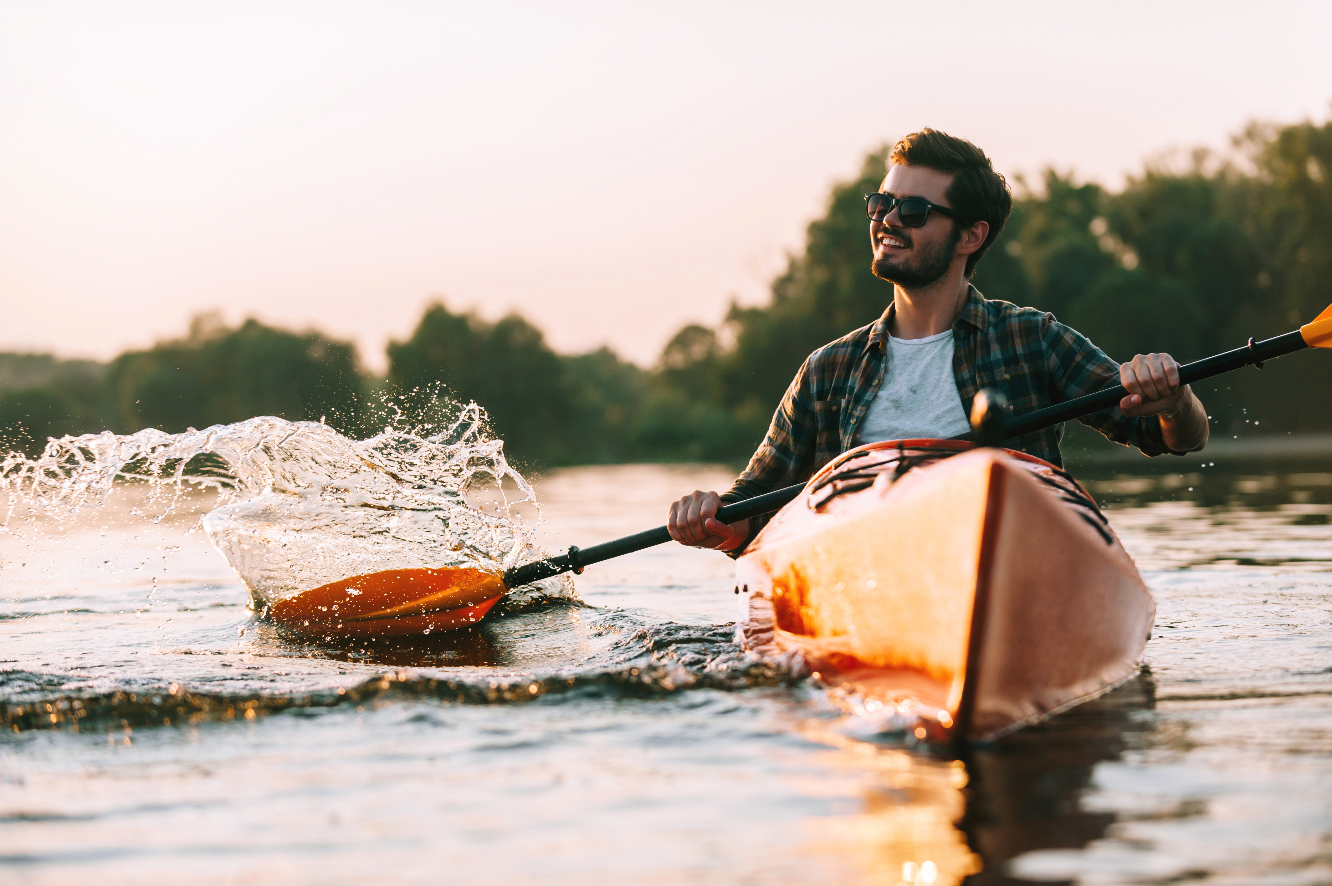 Disfrutando de la vida en el río. Hombre guapo y sonriente salpicando agua mientras kayak en el río
