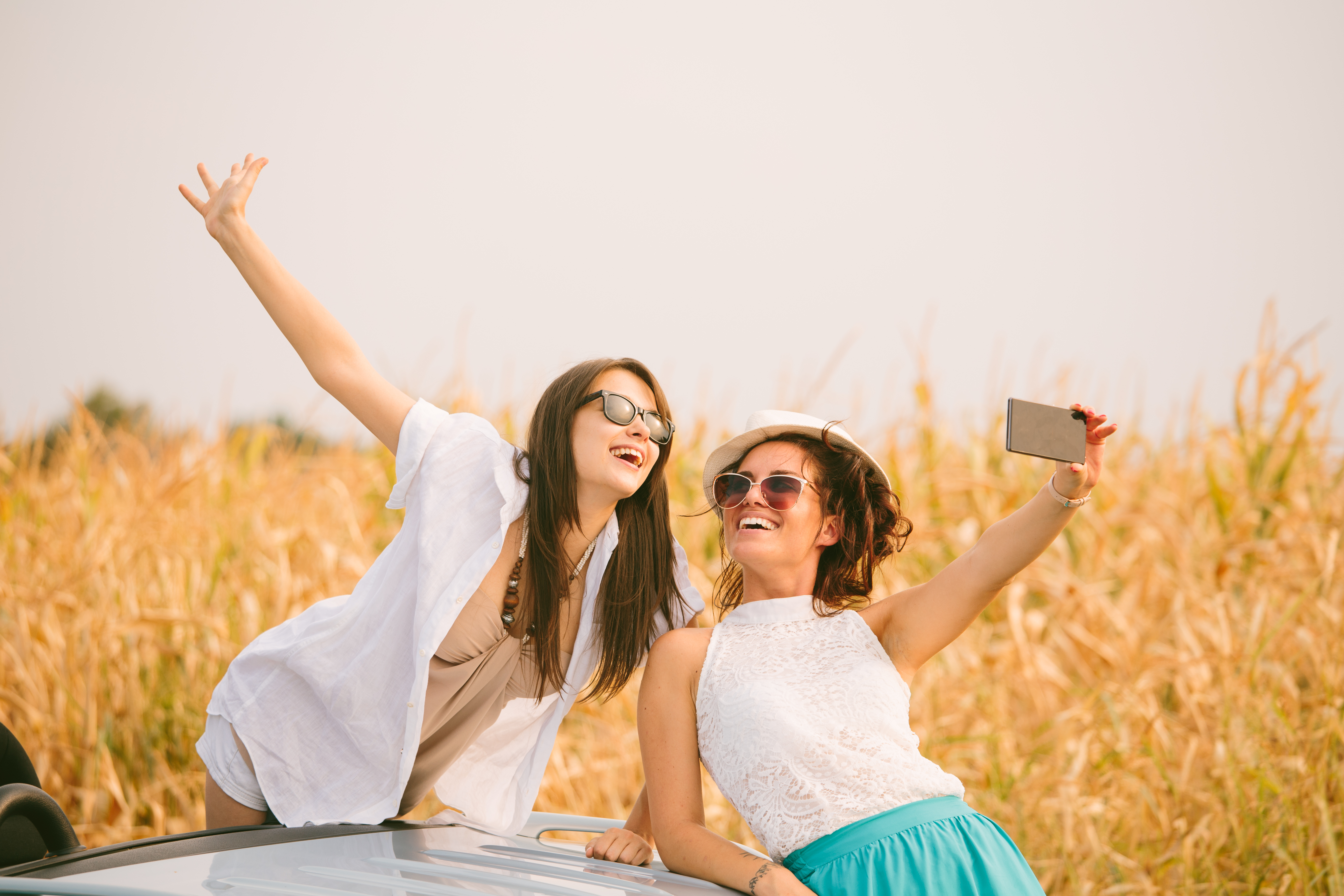 dos amigas junto al cabriolet tomando selfies con smartphones ID: 89886 Dos amigas junto al cabriolet tomando selfies con smartphones