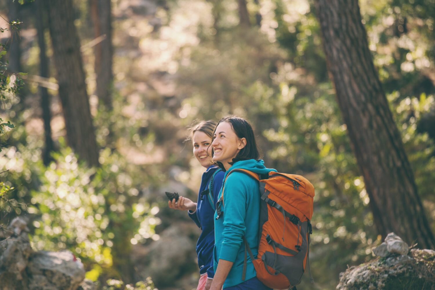 Dos chicas caminan por el bosque.Caminando por las montañas. Las novias pasan tiempo juntos en la naturaleza. Las mujeres caminan por el parque.