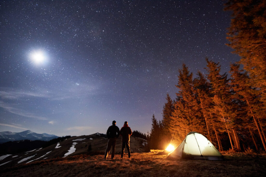 Dos excursionistas descansan en su campamento cerca del bosque por la noche. Hombres parados cerca de la fogata y la tienda bajo un hermoso cielo nocturno lleno de estrellas y luna, y disfrutando de la escena nocturna