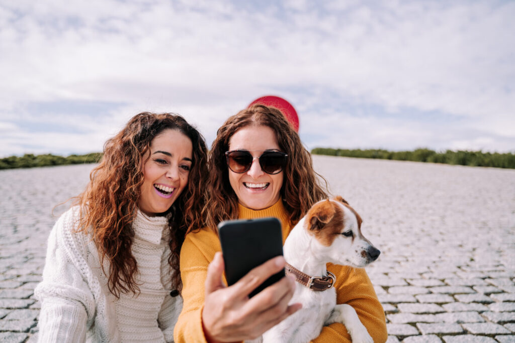Dos hermosas mujeres sentadas con un pequeño perro en un parque de Madrid tratando de tomar una foto con el teléfono. Estilo de vida tecnológico con perros