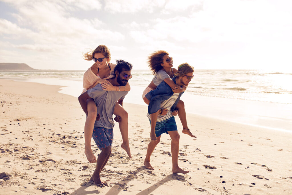 Dos hermosas parejas jóvenes que caminan por la playa, con hombres dando paseos en piggyback a las mujeres. Videojuegos de contrapeso en vacaciones en la playa.
