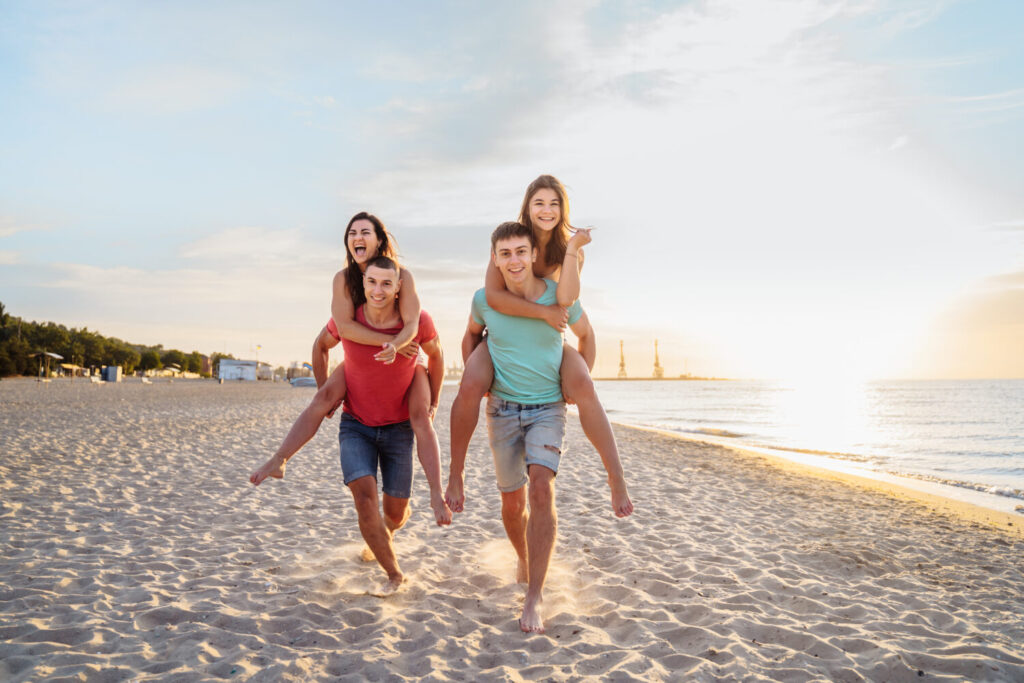 Dos hombres dan paseos en piggyback a sus novias. Jóvenes amigos alegres disfrutando del verano en la playa al aire libre. Las chicas montando a sus novios en la espalda. Riéndose alegremente, gritando, regocijándose.