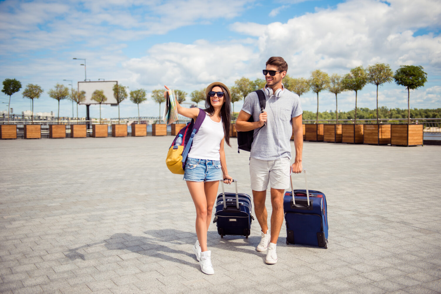Dos jóvenes amantes sonrientes con maleta caminando desde el aeropuerto de la ciudad.