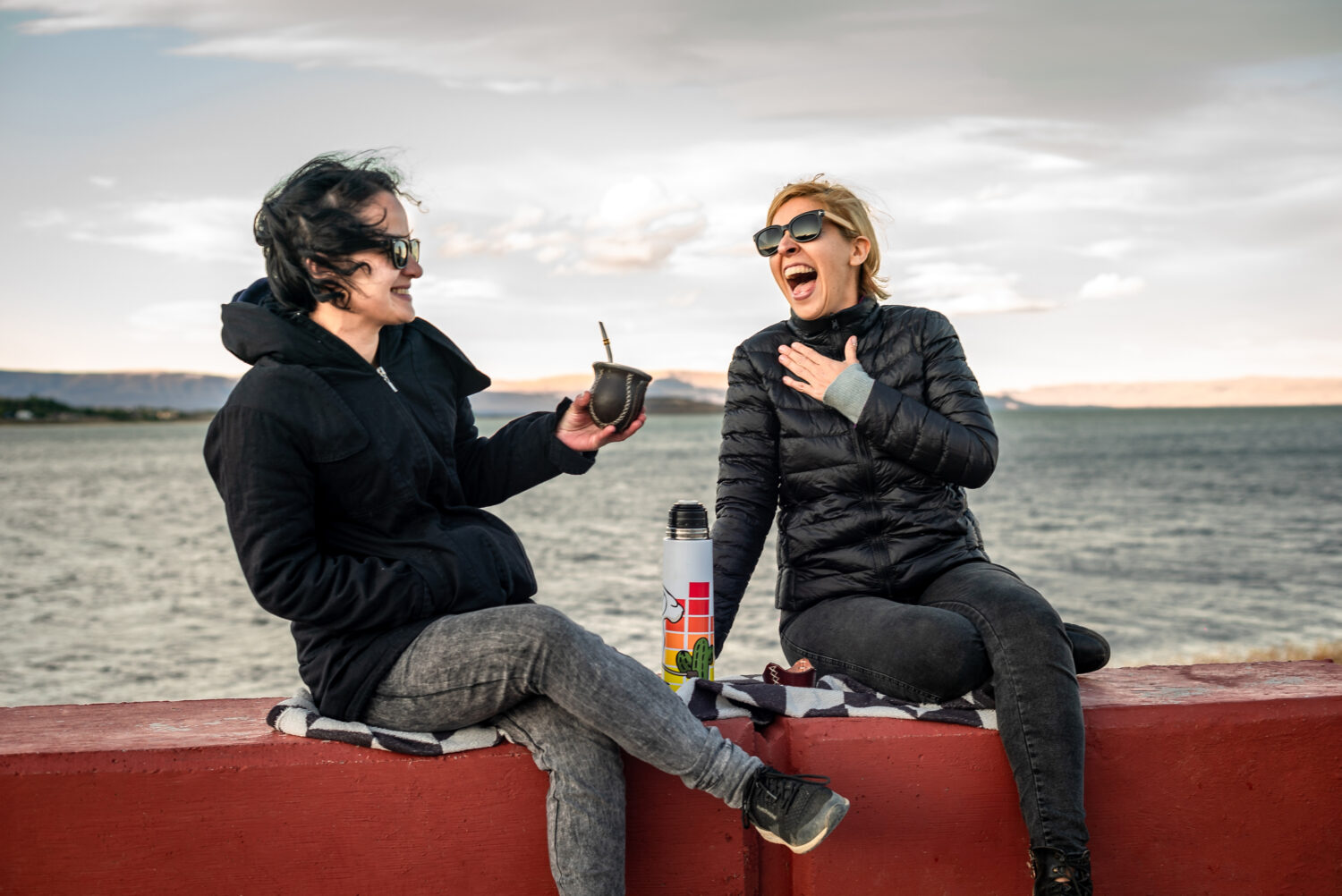 Dos jóvenes latinas ríen y beben yerba mate al aire libre en el fondo del lago. Patagonia. El concepto de amistad, las bebidas tradicionales en Sudamérica