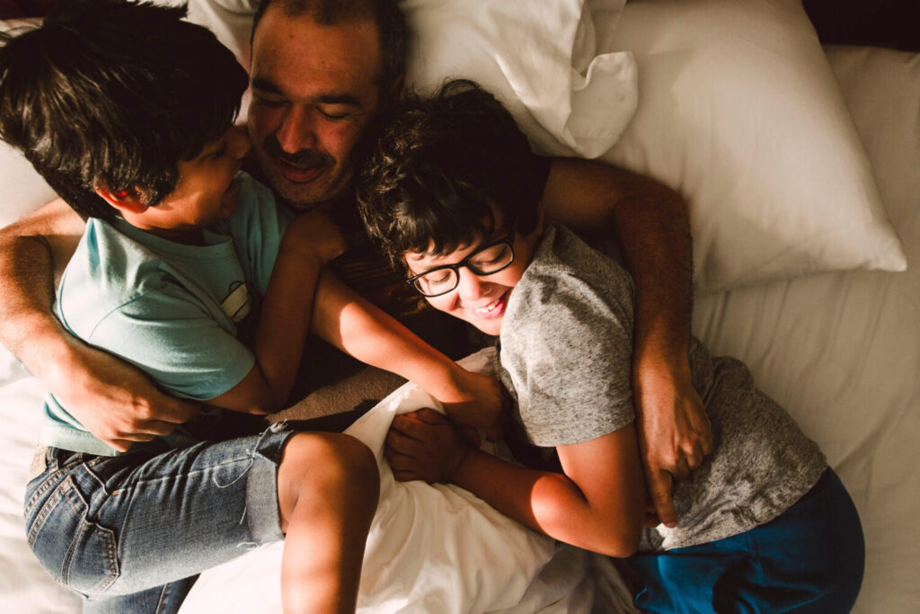 dos ninos son abrazados por su padre en la cama ID: 81241 Dos niños son abrazados por su padre en la cama