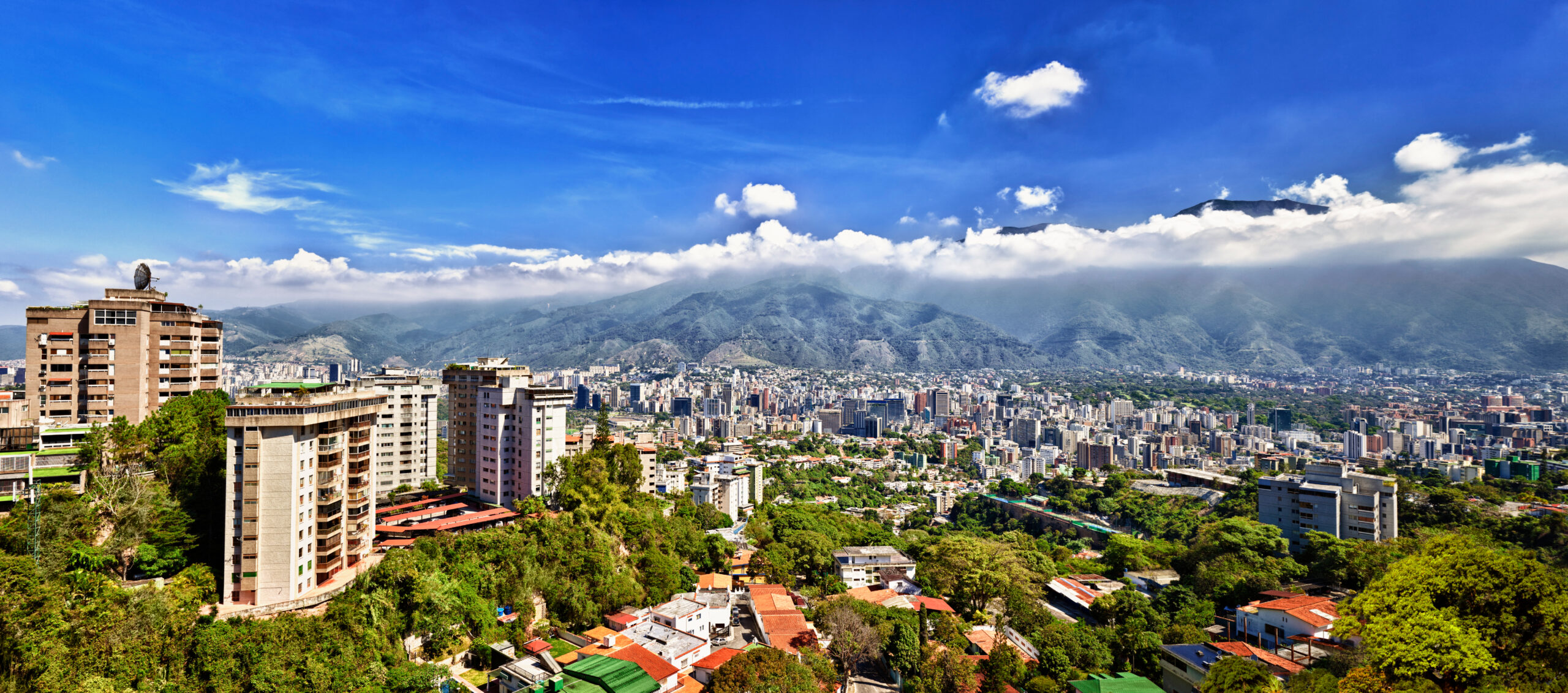 Panoramic image of eastern Caracas city aerial view at late afternoon. Venezuela. Showing El Avila mountain.